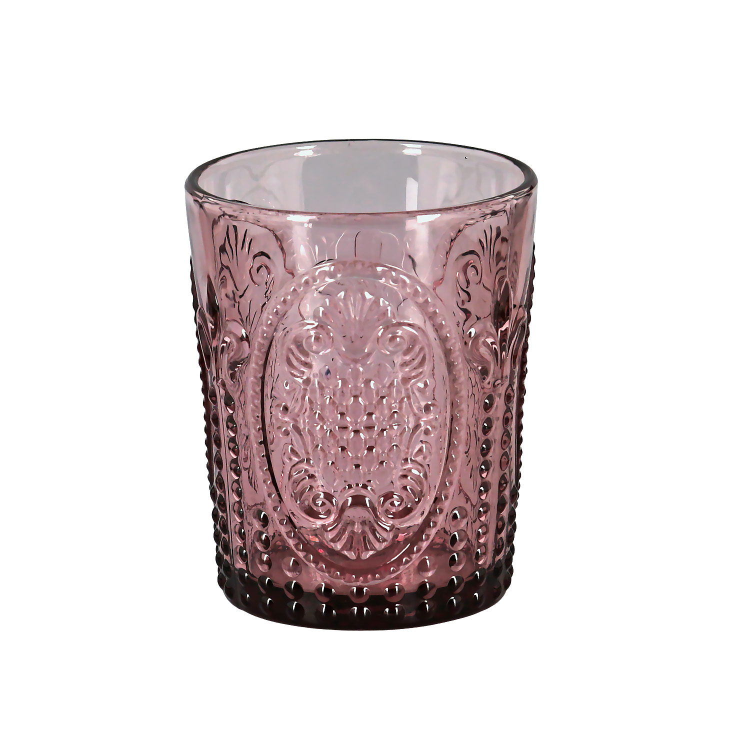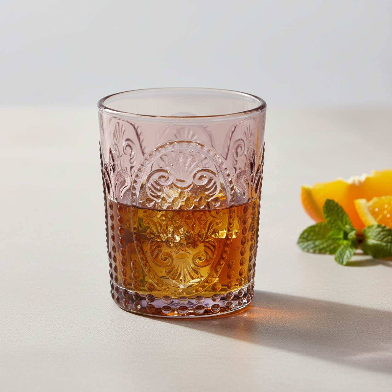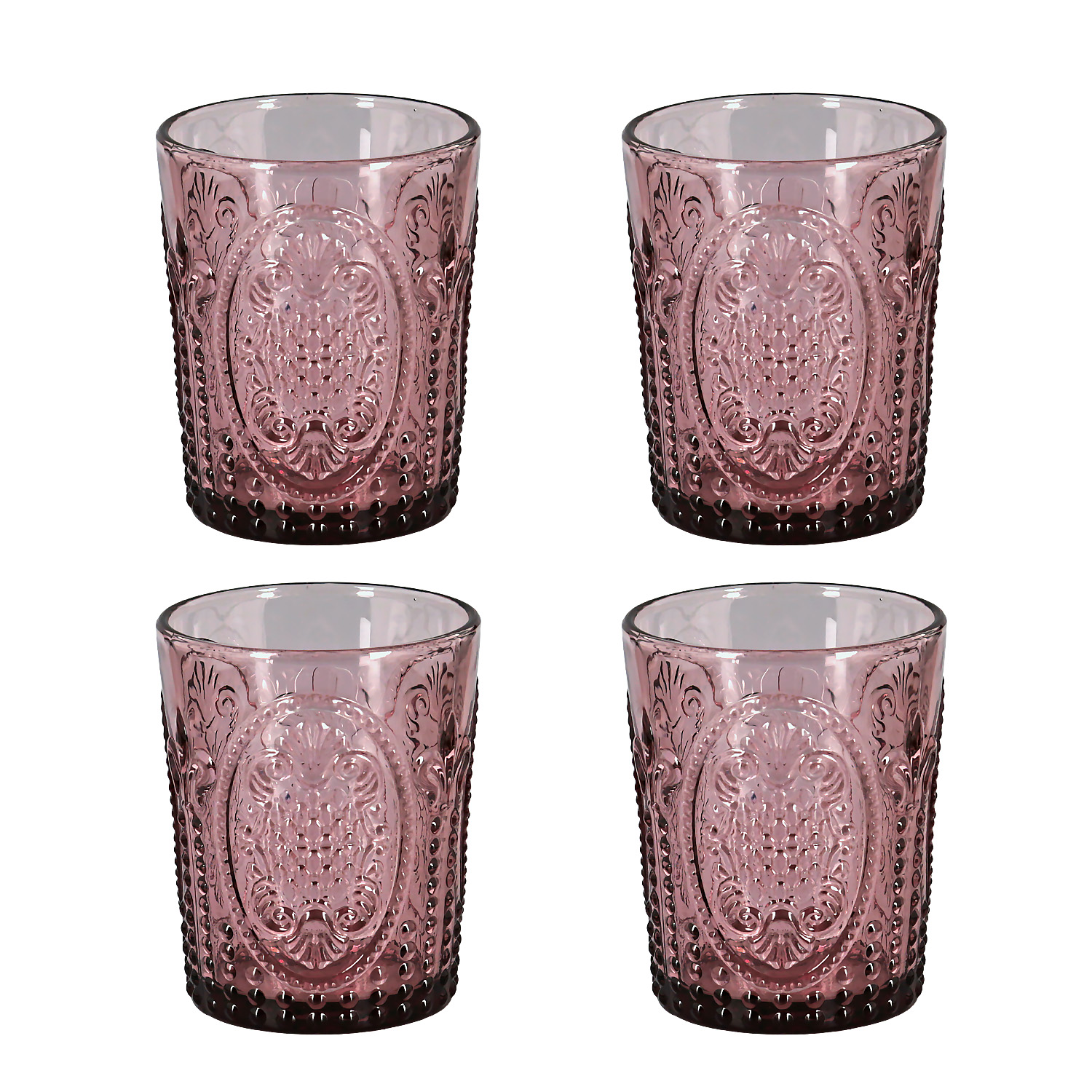Bardaklar, zarif mor rengindedir. Silindirik formdaki gövdesi, ışığı güzelce yansıtan kabartmalı ve dokulu bir yüzeye sahiptir.