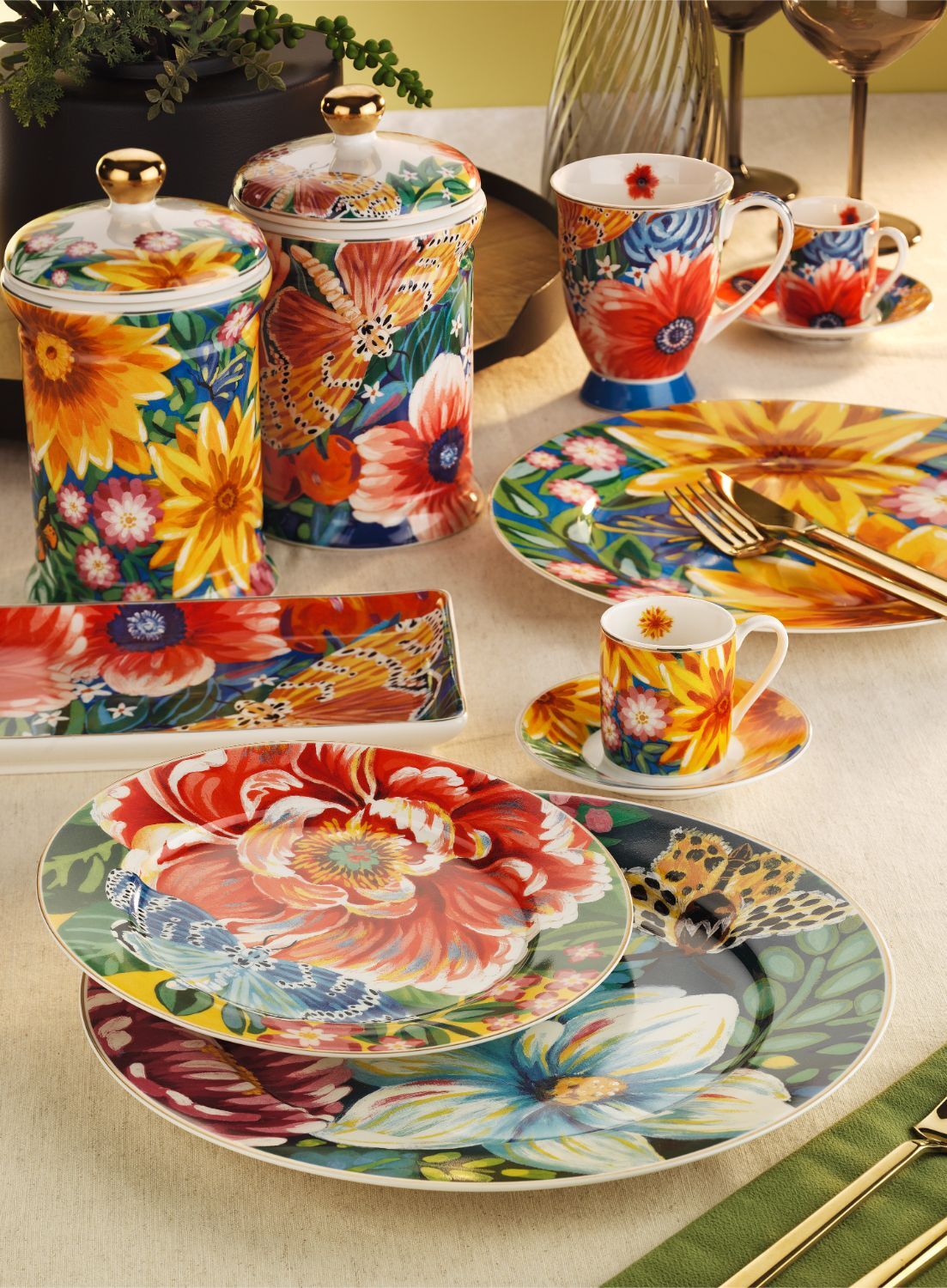 Görkemli Desenler ve Modern Estetik: Dev çiçek motifleri, kelebek detayları ve canlı renk bloklarıyla tasarlanan Vivelle serisi, porselenin beyazlığını bir tuval gibi kullanarak sunumlarınıza sanatsal bir derinlik kazandırır. Set içerisindeki farklı desen kurguları, kahve köşenizde hareketli ve modern bir görsel ritim oluşturur.