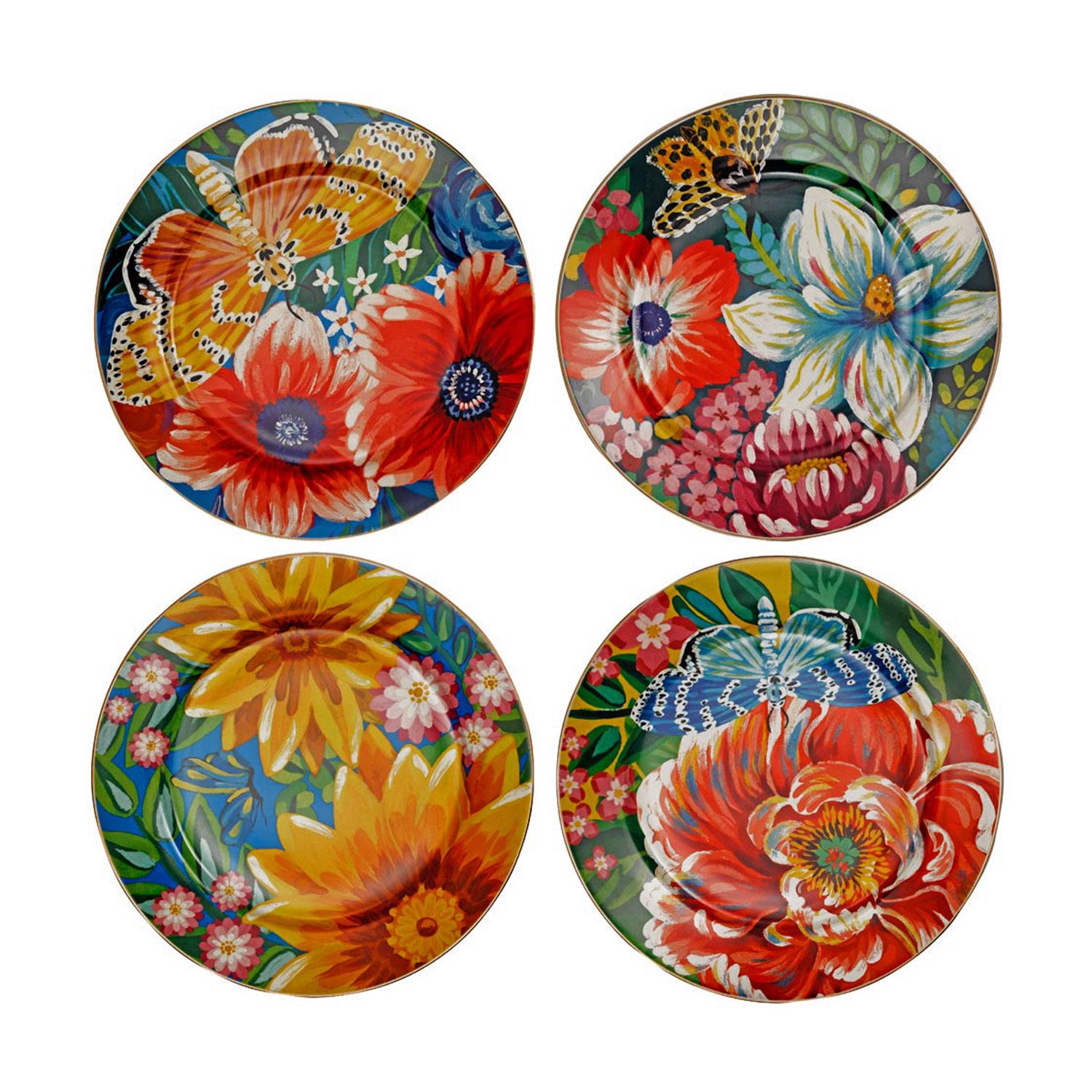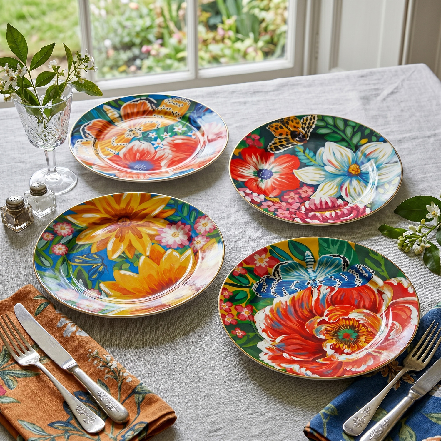 Sanatsal ve Canlı Tasarım: Tabak yüzeyini tamamen kaplayan canlı kırmızı, güneş sarısı, derin mavi ve yaprak yeşili tonları; porselenin pürüzsüz dokusuyla birleşerek masanızda bir sanat galerisi etkisi yaratır. Her tabaktaki farklı çiçek ve kelebek kurgusu, her misafirinize kendine has bir görsel hikaye sunar.