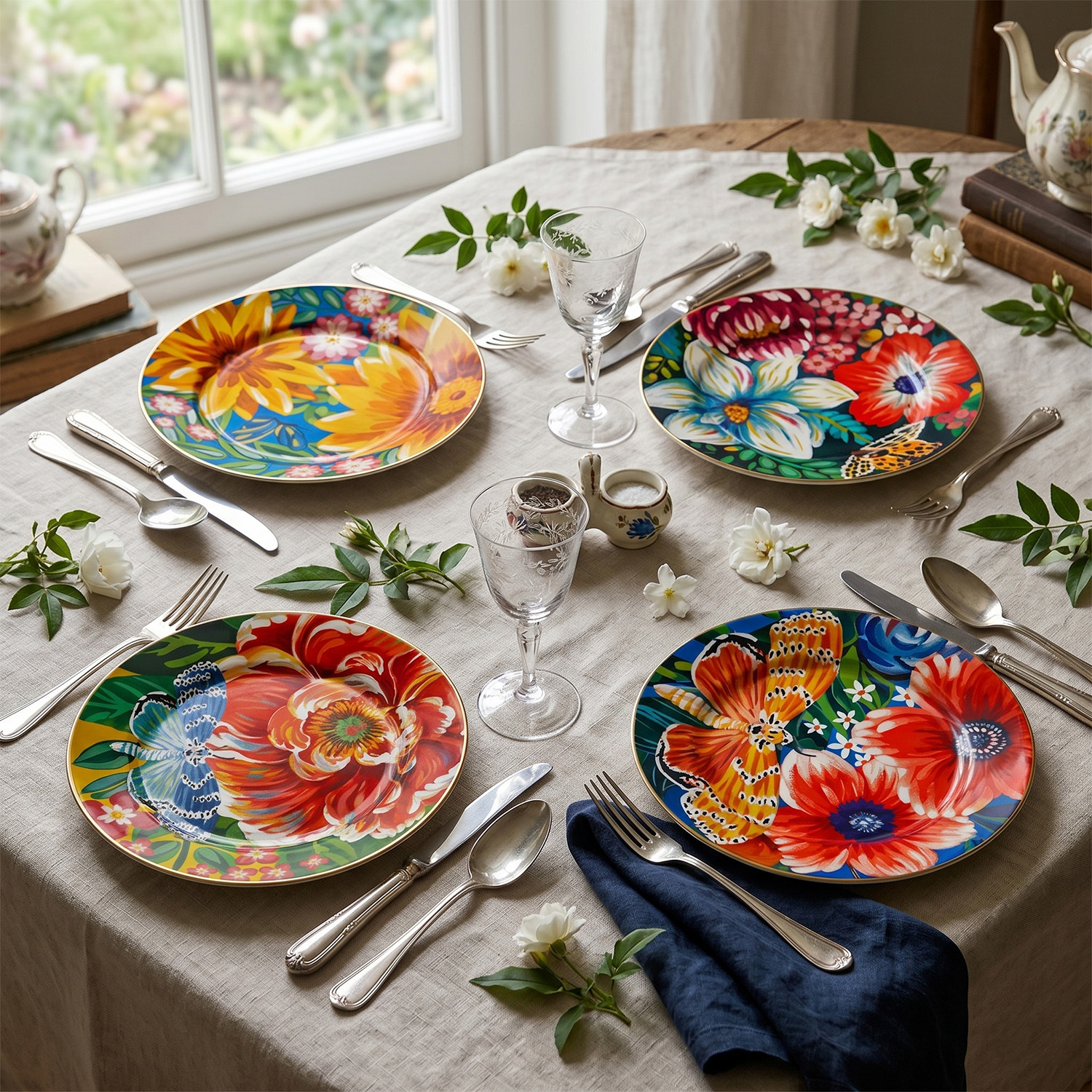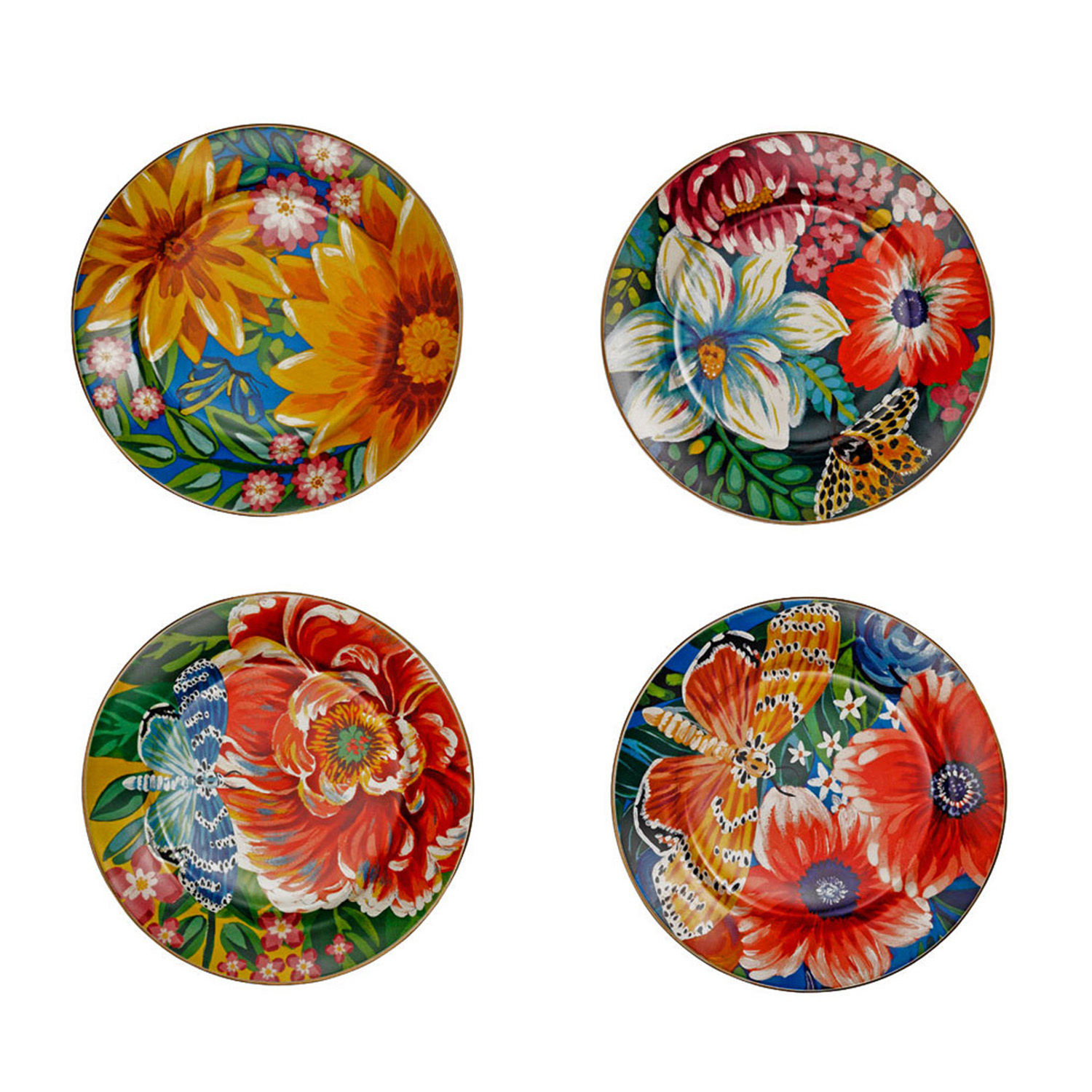 Sunumlarınıza doğanın en canlı renklerini ve baharın neşesini davet edin! Vivelle serisinin imzası olan devasa çiçekler, rengarenk kelebekler ve zengin botanik desenlerini porselenin zarafetiyle buluşturan bu 4'lü set, masanızın en enerjik ve sanatsal parçası olacak.