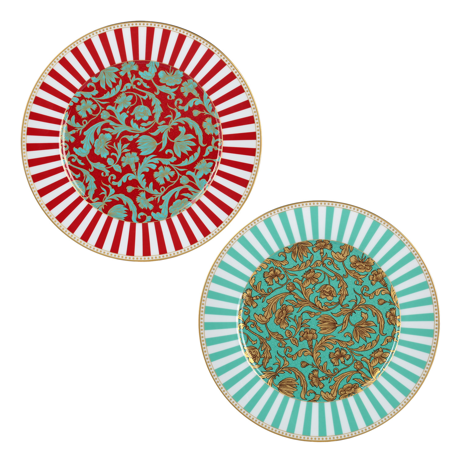 Görsel Detaylar: Bir tabak kırmızı çizgili bordür ile çevrelenmiş yeşil/kırmızı motiflere, diğeri ise turkuaz çizgili bordür ile çevrelenmiş turkuaz/altın motiflere sahiptir.