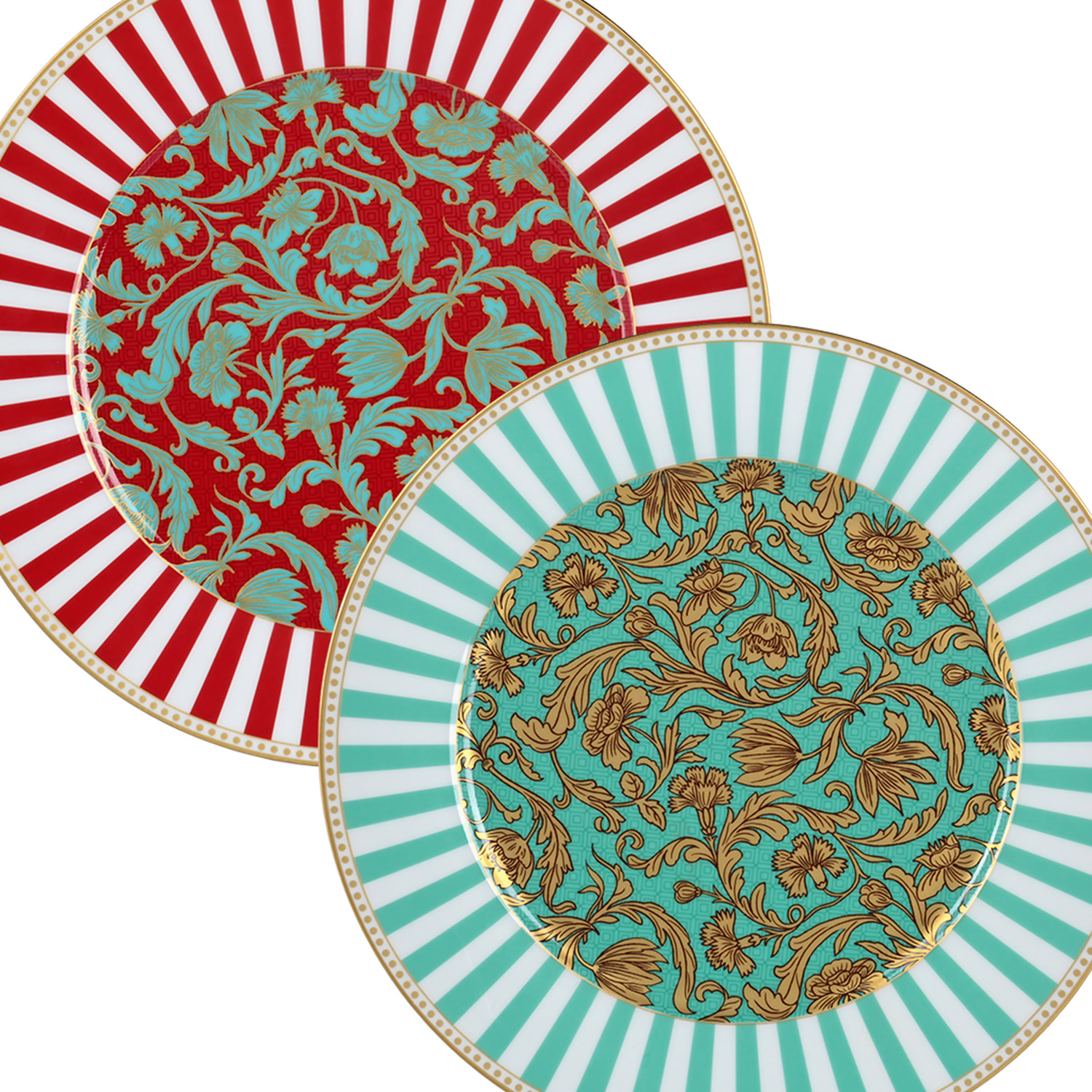 ZEFLORA Bone 27 cm Tabak Seti, sofranızın merkezine asalet ve canlılık katmak için özel olarak tasarlanmıştır. Yüksek kaliteli Bone China porselenin pürüzsüz yüzeyinde hayat bulan bu tasarım, klasik floral motifleri modern çizgisel bordürlerle birleştirerek eklektik bir şıklık sunar. Setin bir parçasında tutkulu kırmızı ve yeşil detaylar, diğerinde ise asil turkuaz ve altın sarısı tonları hakimdir.