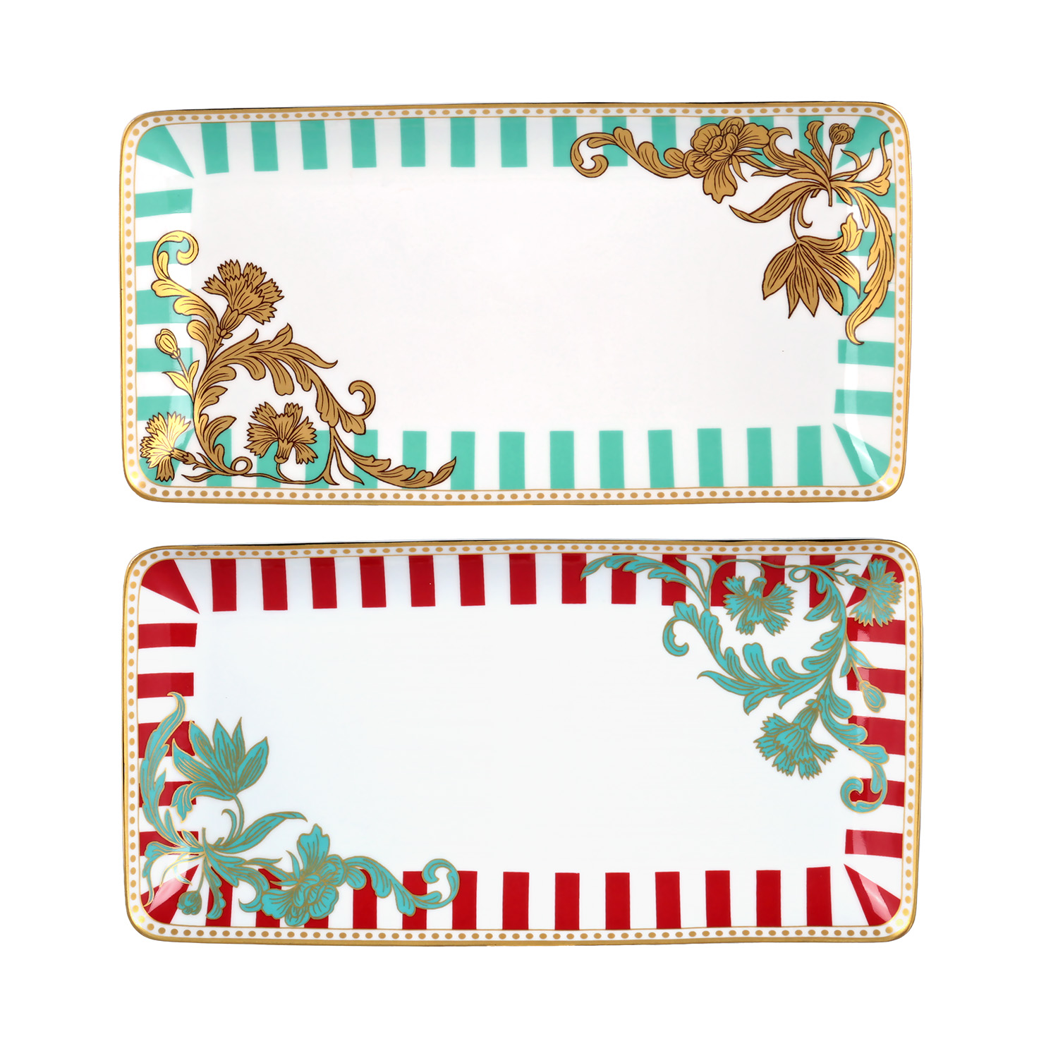 Bir tabak turkuaz çizgili bordür ve altın sarısı floral detaylara; diğeri ise kırmızı çizgili bordür ve yeşil floral detaylara sahiptir.