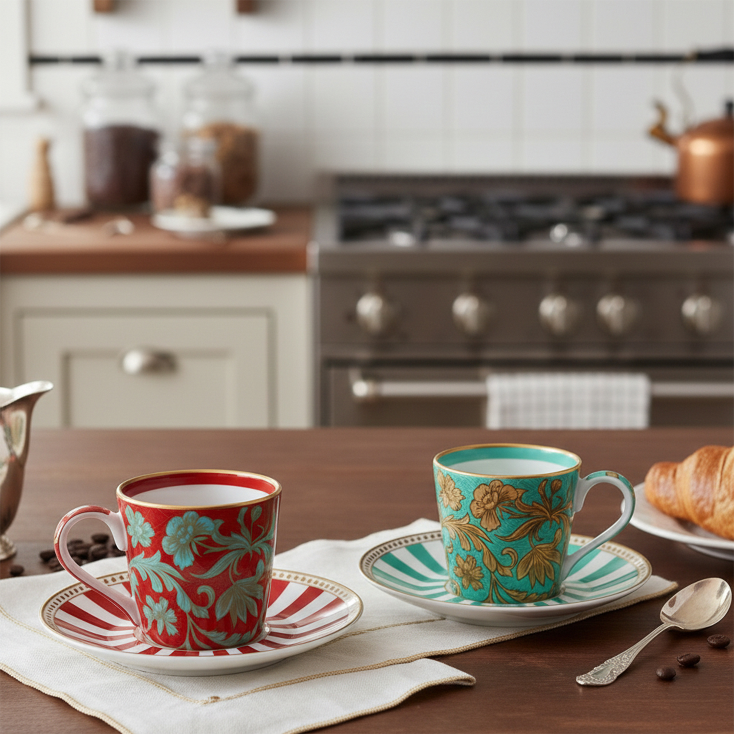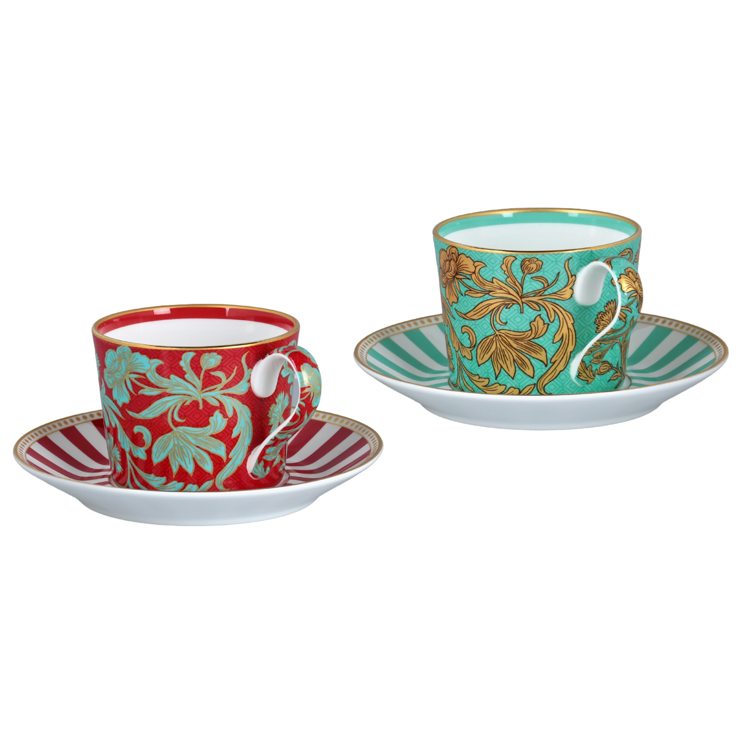Tasarım: Set, kontrast oluşturan iki farklı renk ve desen kombinasyonundan oluşur. Bir fincan kırmızı/yeşil floral desenlere, diğeri ise turkuaz/altın desenlere sahiptir.