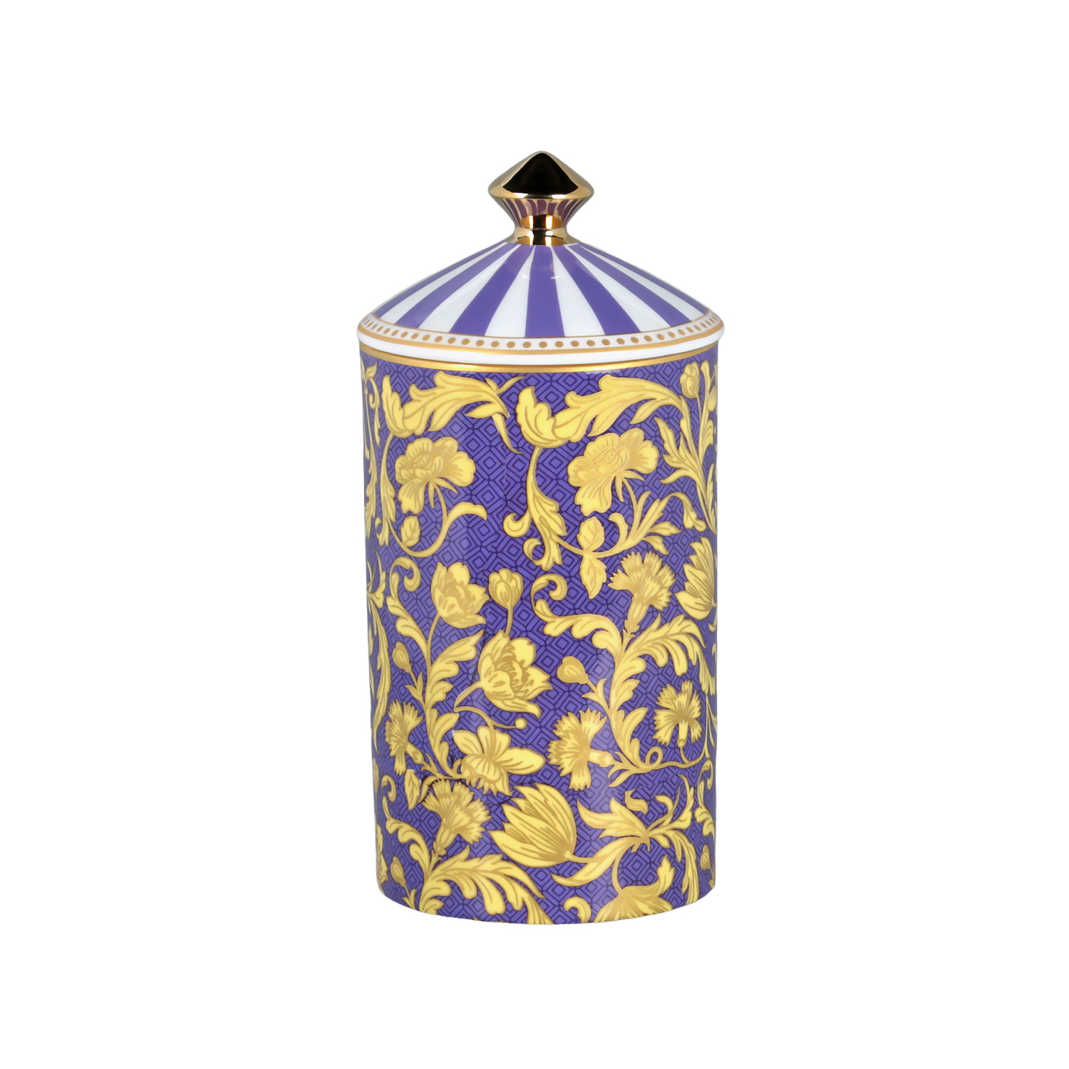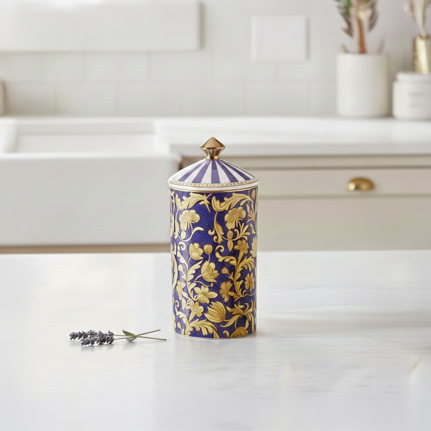 Tasarım: Kavanoz gövdesi, saks mavisi üzerine klasik ve zengin altın sarısı floral desenlerle bezelidir.